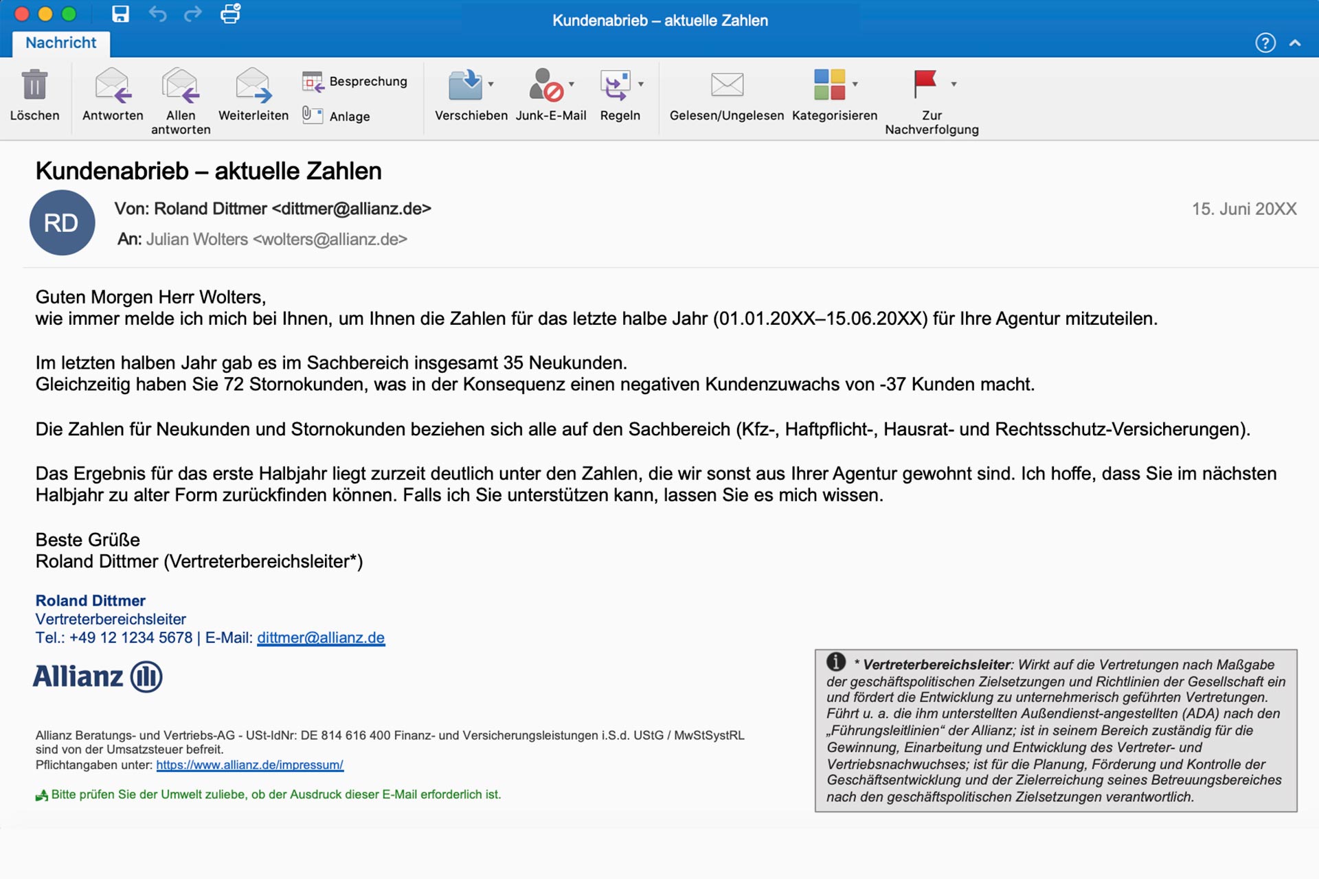 Lesen Sie die E-Mail, die der Vertreterbereichsleiter Roland Dittmer an Herrn Wolters zu den aktuellen Zahlen des Kundenabriebs geschickt hat.