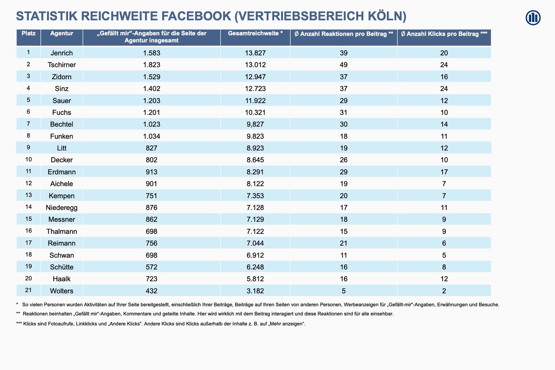 Nachfolgend ist für Sie eine Statistik zur Facebook-Reichweite des Vertriebsbereichs Köln aufgeführt.